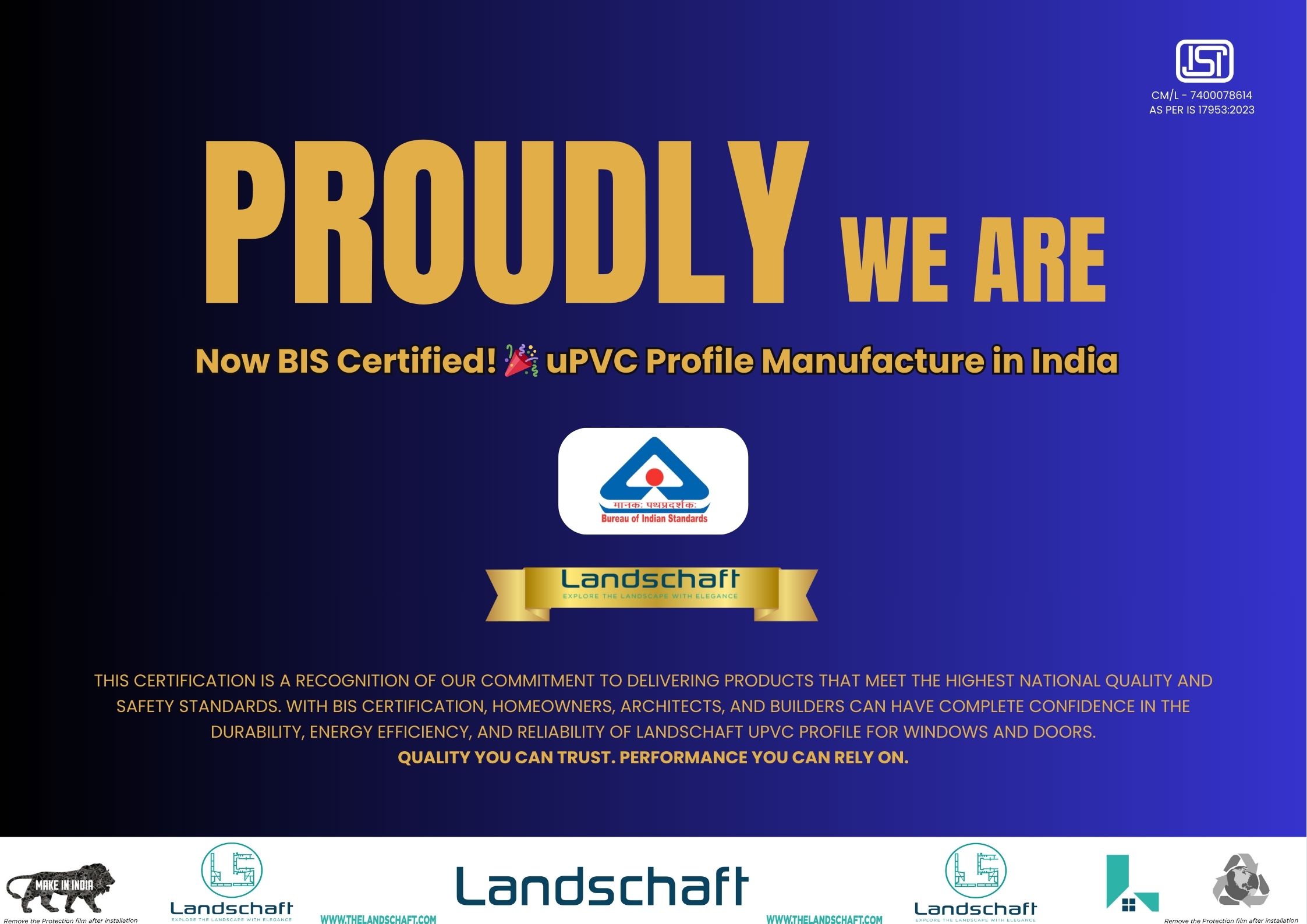 We are thrilled to announce that Landschaft is now officially BIS Certified for uPVC profiles manufactured in India! Landschaft continues its commitment to excellence by meeting the highest national quality and safety standards under IS 17953:2023, recognized by the Bureau of Indian Standards (BIS).